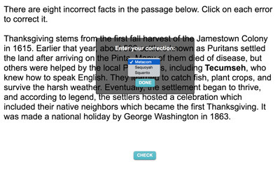 This fun activity requires students to correct a passage about 13 Colonies Trades that has nine factual errors. Students first must discover the errors, then click on them and select the correct answer from the drop down menu.