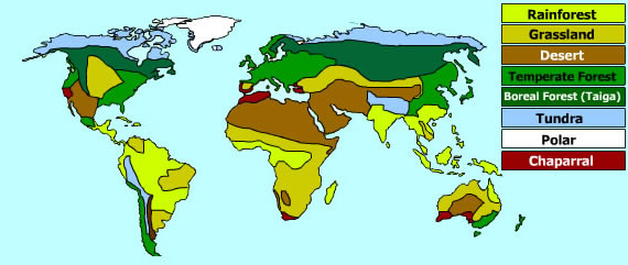 | * Southern portions of the Taiga belt are dominated by evergreen trees (sometimes called boreal forest.) Such trees grow close together for protection from the bitter cold and wind. |